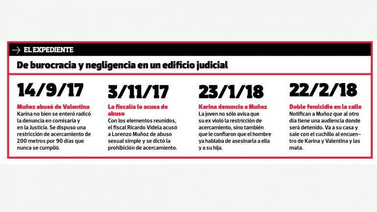 De acuerdo con lo consultado por LMN, a Muñoz se lo podría haber detenido contemplando la denuncia y la situación de riesgo en que se encontraba Karina y Valentina. A esto se suma que Muñoz violó al menos tres veces la restricción de acercamiento y el Juzgado de Familia solamente lo llamó para apercibirlo, siendo que el asesino tenía antecedentes de su anterior relación, de no respetar las medidas judiciales.