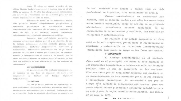 A horas de que Fernando Burlando adelantara que Juan Darthés no regresará al país para asistir a la mediación que tiene con Anita Coacci, la abogada de la actriz escrachó al actor al mostrar unos informes realizados por Miriam Simoes Candido, la psicóloga que lo atiende en Brasil, para justificar la ausencia en tribuales del también cantante de tango.