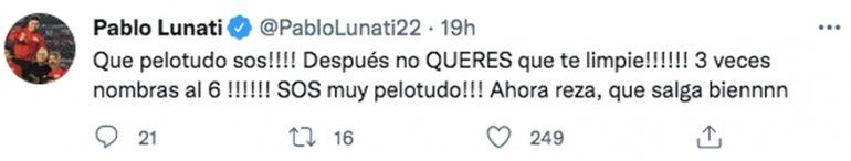 Luego, ya dirigiéndose en forma indirecta a Lunati se refirió a “algún árbitro” que “cuando nos dirigió” (por All Boys, el club de sus amores), “hasta lo insulté”. “Por ahí, me quedé corto”, agregó.