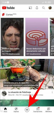 Para publicar tus videos en Cortos deberás abrir la aplicación móvil de YouTube. Allí, pulsar sobre el botón + de Crear, que se encuentra en la parte inferior de la pantalla. Este sirve para publicar un nuevo contenido en la plataforma desde tu teléfono móvil.