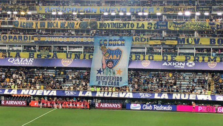 El club de la ribera colocó en el círculo central un cartel redondo con el escudo "xeneize" y la inscripción "Bienvenido Diego", mientras miles de hinchas cantaban por quien fue jugador de la institución en dos etapas, 1981-82 y 1995-97.