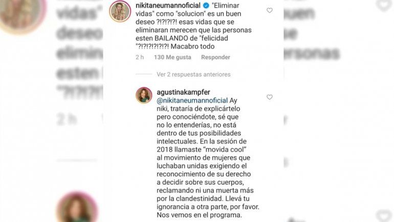 Lejos de quedarse callada, Kämpfer decidió responderle a su compañera por la misma red social. "Ay Niki, trataría de explicártelo pero conociéndote, sé que no lo entenderías, no está dentro de tus posibilidades intelectuales. En la sesión de 2018 llamaste ‘movida cool’ al movimiento de mujeres que luchaban unidas exigiendo el reconocimiento de su derecho a decidir sobre sus cuerpos, reclamando ni una muerta más por la clandestinidad. Llevá tu ignorancia a otra parte, por favor. Nos vemos en el programa”.