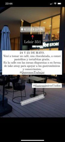 El dueño y los empleados de la cafetería que este domingo incumplió con las restricciones vigentes y abrió su local normalmente, con atención dentro del local, anunció que durante los feriados del 24 y 25 de mayo reparte café, chocolate, tortas fritas y pastelitos como forma de reclamo.