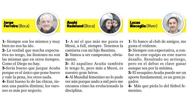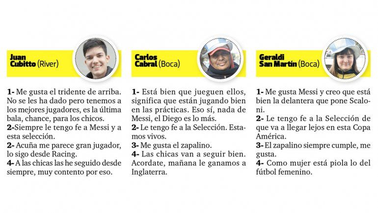 El portero y el propietario. La madre y el hijo. Los amigos. Uno que se bajaba del auto y otra que se subía al bondi en medio de la nota. Y eso que dicen que los argentinos son más hinchas de su club que de la Selección. Y eso que aún no hay tanto clima de Copa América. Casi todas las personas a las que paramos por la calle accedieron a la encuesta, se prendieron con la iniciativa y dejaron su valioso punto de vista.