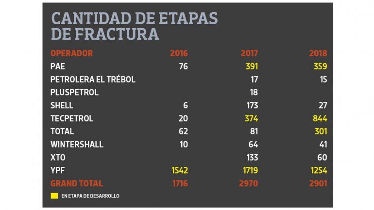 En el caso de la francesa Total, hacen 10 fracturas por pozo, un punzado cada 100 metros en pozos de rama horizontal de hasta 2600 metros. La compañía advierte que se trata de lo óptimo para el diseño de pozos que están en la cuenca, donde hicieron 444 fracturas en los últimos 3 años; 301 en los primeros ocho meses de 2018.