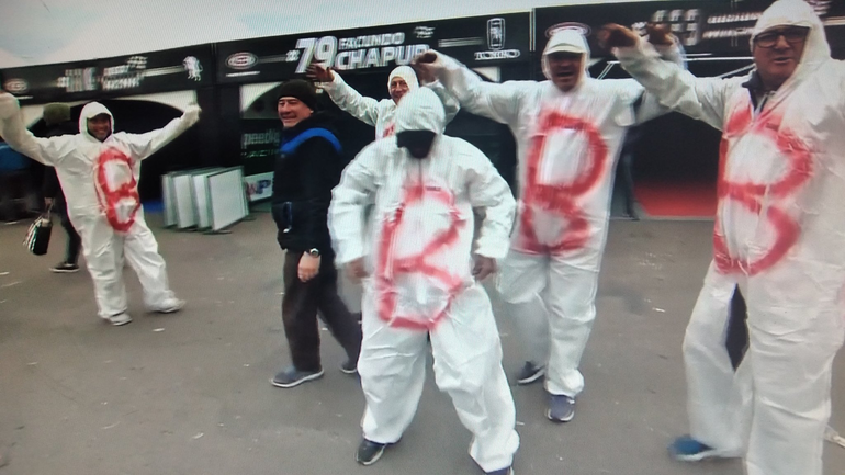 Este domingo en las carreras del Turismo Carretera, en plena transmisión de la televisión, se pudo ver a un grupo de fanático tuercas vestidos con unos trajes blancos que tenían pintada una "B" roja en el abdomen.