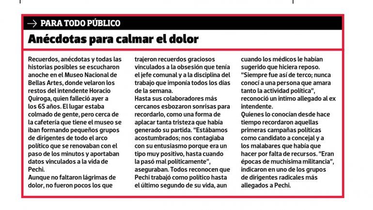 El intendente Horacio “Pechi” Quiroga fue hallado muerto por una de sus hijas, ayer a las 8:45, en la cama. Tenía 65 años, siete hijos y una nieta. Su muerte inesperada generó dolor y conmoción y demostraciones de cariño que se multiplicaron por miles, al igual que las muestras de respeto de todo el arco político, de los de su partido y de sus adversarios.