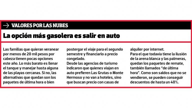 La escalada del dólar y la inflación obligaron a cambiar de planes a los neuquinos que se habían acostumbrado a pagar unas vacaciones en cuotas en las blancas playas caribeñas. Salir al exterior por una semana hoy no baja de 35 mil pesos por persona y, al norte del ecuador, el precio supera los 50 mil.