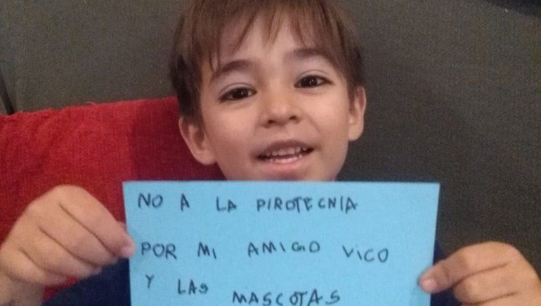 Con tan solo 6 años, le pidió a su mamá que lo ayude a confeccionar un folleto con la leyenda "No a la pirotecnia, por mi amigo Vico y las mascotas". Hicieron 60 fotocopias y el miércoles debutó con la campaña en pleno centro cipoleño.