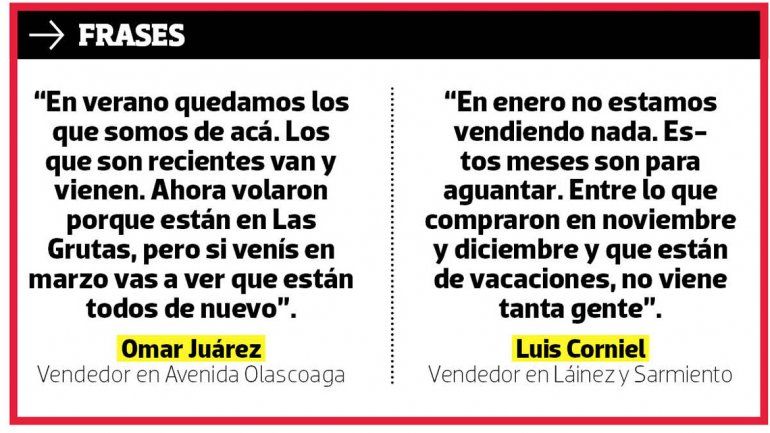 Luis Cornier, un vendedor que ofrece su mercadería sobre Láinez y Sarmiento, confirma: “No hay tantos vendedores porque muchos aprovechan que estos meses están muertos y se van, muchos arrancan para Las Grutas y otros aprovechan donde haya más chance de venta”.