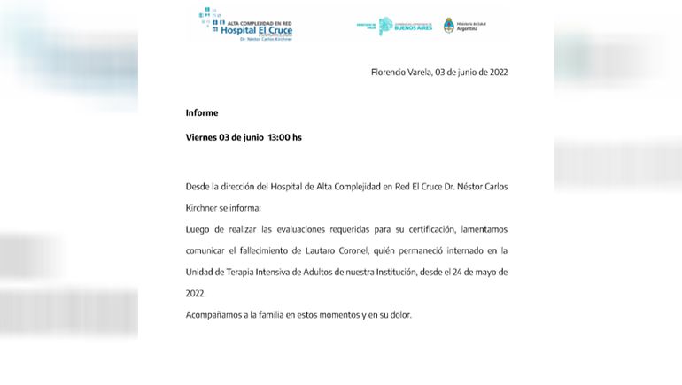 “Viernes 03 de junio 13:00 horas. Desde la dirección del Hospital de Alta Complejidad en Red El Cruce Dr. Nestor Carlos Kirchner se informa: Luego de realizar las evaluaciones requeridas para su certificación, lamentamos comunicar el fallecimiento de Lautaro Coronel, quién permaneció internado en la Unidad de Terapia Intensiva de Adultos de nuestra institución, desde el 24 de mayo de 2022. Acompañamos a la familia en estos momentos y en su dolor”, aseguraron desde el hospital.