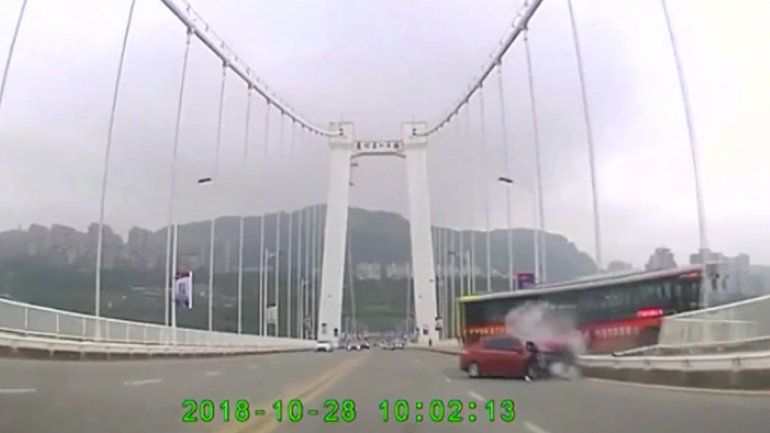 En ese momento se observa cómo pierde el control del vehículo y trata de recuperarlo, pero ya es tarde. Choca contra un auto que venía en sentido contrario, rompe la baranda del puente y cae desde una altura de 70 metros al río Yangtze.