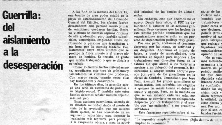 “Por una parte, anotamos el creciente desprecio por las masas, su actividad y sus dirigentes. Anotemos el intento de hacer, apunta de ametralladora, una asamblea en Squibb, para imponer a los trabajadores una dirección fuera de la fábrica (lo que alentó a los fascistas a asesinar a un delegado del personal). Recordemos el ataque contra obreros presos por parte de los guerrilleros en la cárcel de Córdoba, denunciado por José Páez. Siempre los grupos guerrilleros se consideraron, con soberbia, los elegidos a quienes las masas tienen el deber de seguir y apoyar. Pero, en la medida en qué se van aislando cada vez más, ese disparate se convierte en un enloquecido desprecio por los trabajadores y el pueblo que “no entienden” a sus presuntos salvadores.”