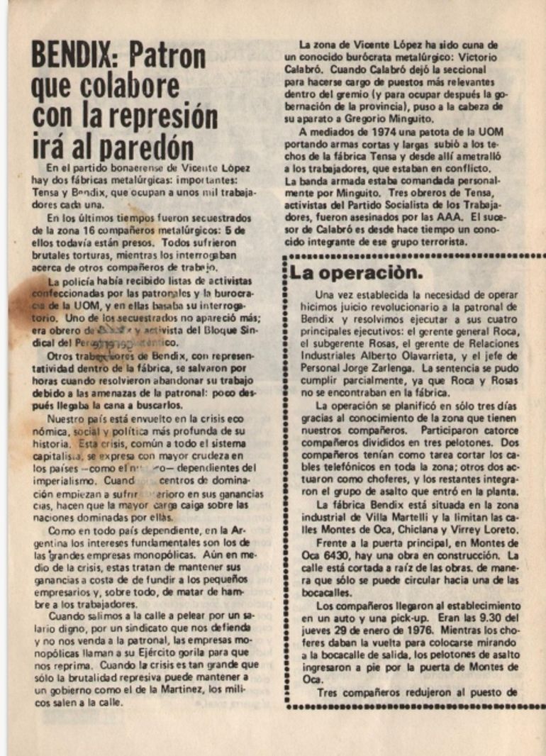 “No es casual qué, algunos de los últimos asesinatos, sean adjudicados simultáneamente a las Triple A y a la guerrilla (la muerte del policía que custodiaba al diputado anti-lopezrreguista Porto, y las de los que cuidaban, el domicilio de una diputada calabroista de la provincia de Buenos Aires). Que pueda producirse esta confusión muestra a las claras hasta donde las organizaciones guerrilleras se alejan cada vez más de la política que dicen representar. Nadie puede explicar la utilidad desde el punto de vista de la clase obrera y el pueblo de estos crímenes. Por eso ni siquiera se puede distinguir si son obra de la guerrilla o de las bandas fascistas.”