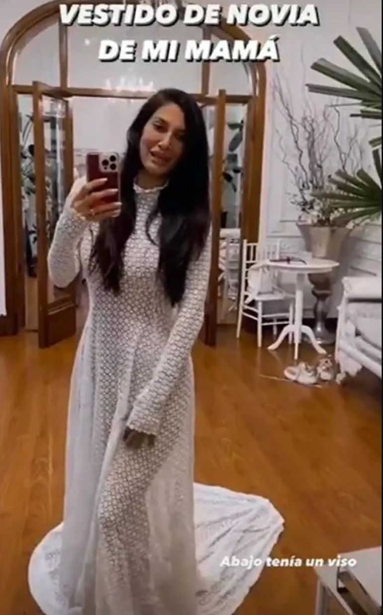 "Este es el vestido de novia de mi mamá, el que usó cuando se casó, no puedo creer que me entre, mamá era súper flaquita... Emoción", escribió en sus redes al mostrar cómo lucia el vestido.