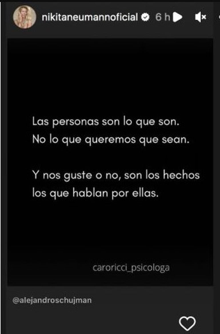 Para Nicole Neumann es habitual que cuando no puede decir algo sin rodeos busque la forma de hacerlo pero desde otra posición. Es por eso que compartió una frase de una cuenta de Instagram con un duro mensaje en esta.