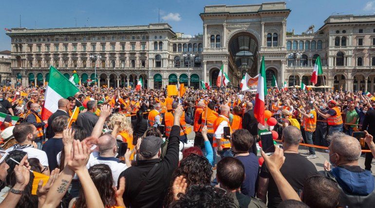 "Tienen al pueblo en arresto domiciliario"; fue otra de las consignas que lanzó el grupo que busca presentarse como una variación cromática de los chalecos amarillos franceses, aunque con considerablemente menos cantidad de gente en las calles de las principales ciudades italianas.