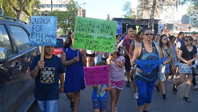 Un grupo de familiares y allegados a la familia policial marcharon este sábado por la tarde por las calles céntricas en reclamo justicia por las muertes de Emiliano Amaya y de Luis Gabriel Nahuelcar.