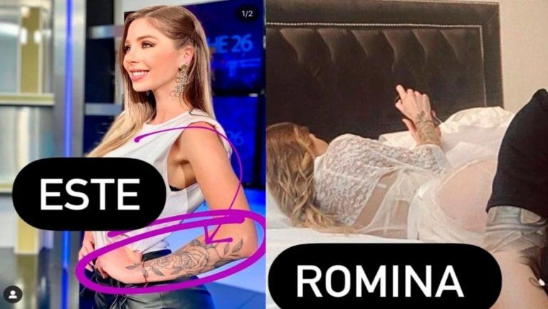 Entre los puntos que enfatizó Braier, se encuentra el cabello rubio, el físico y un tatuaje en el brazo que tienen en común Romina Malaspina y la mujer que aparece de fondo en la postal, recostada en la cama y con un celular en la mano.