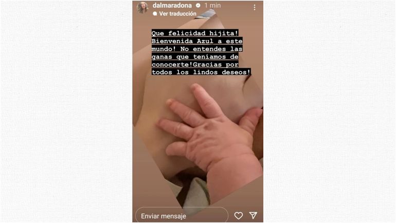 El anuncio del nacimiento de la pequeña lo había hecho horas antes la propia Dalma Maradona, cuando en una storie de Instagram compartió de la manito de la pequeña. “¡Qué felicidad, hijita! ¡Bienvenida Azul a este mundo! ¡No entendés las ganas que teníamos de conocerte! ¡Gracias por todos los lindos deseos!”, escribió sobre la imagen Dalma.