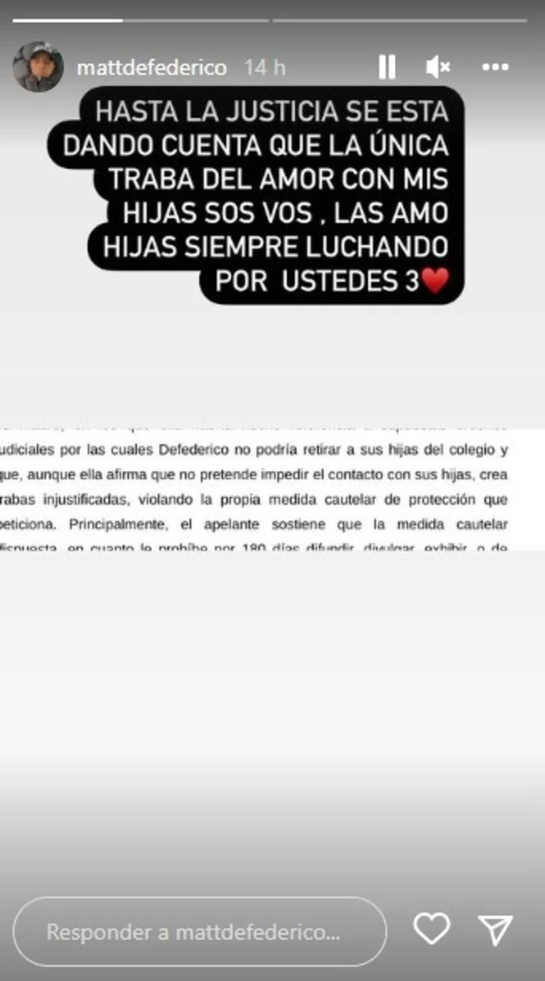 “Hasta la Justicia se está dando cuenta de que la única traba del amor con mis hijas sos vos. Las amo, hijas, siempre luchando por ustedes tres", siguió Matías, que volvió a declararle la guerra a su expareja.