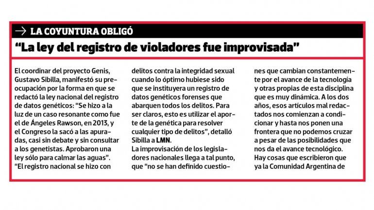 “En Argentina no hay una ley que instituya el registro de datos genéticos forenses para homicidios. Pareciera que para el Estado merece mejor defensa una persona violada que una persona asesinada. Yo abogo porque este sistema se extienda a todos los delitos contra las personas, como pasa en varias provincias del país”, confió Sibilla.