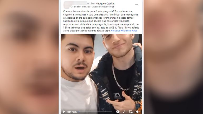 El video en cuestión comenzó a circular en las redes desde el pasado fin de semana, cuando Wos visitó Neuquén para brindar un show en el Parque Central. En la misma se ve a un joven abrazado al cantante -parecía que hacia una selfie-, quien sorpresivamente le hace una pregunta política al músico: le cuestiona el haber dejado de hablar de desigualdad social durante el gobierno de Alberto Fernández, pese a que durante la presidencia de Mauricio Macri no dudó en hacerlo.