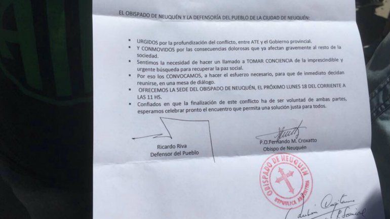 "Urgidos por la profundización del conflicto entre ATE y el Gobierno, y conmovidos por las consecuencias dolorosas que ya afectan gravemente al resto de la sociedad, sentimos la necesidad de tomar consciencia de la imprescindible y urgente búsqueda de soluciones para recuperar la paz social", indica el comunicado.