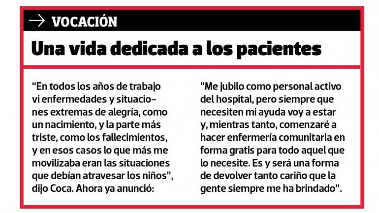 Sin dudas Coca, la enfermera del pueblo, hoy es toda una institución en sí misma. Es una mujer que hizo de su profesión una religión. Sus manos sanaron heridas, pero su oído, sus palabras y sus abrazos curaron almas y corazones desahuciados. Se fue llena de amigos y con un legajo sin tachaduras ni enmiendas.