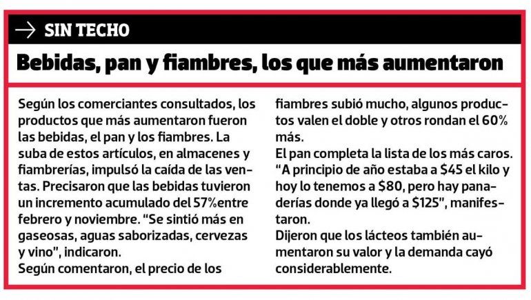 Silvia, dueña de una despensa de la calle Godoy, explicó que la gente gasta la misma cantidad de dinero que a principio de año, pero se lleva menos productos. "Hay gente que pasó del asado a la carne picada y, con lo que le sobra, compra pan", detalló. Agregó que por la dura situación económica perdió una importante cantidad de clientes, lo que compromete la subsistencia de su comercio.