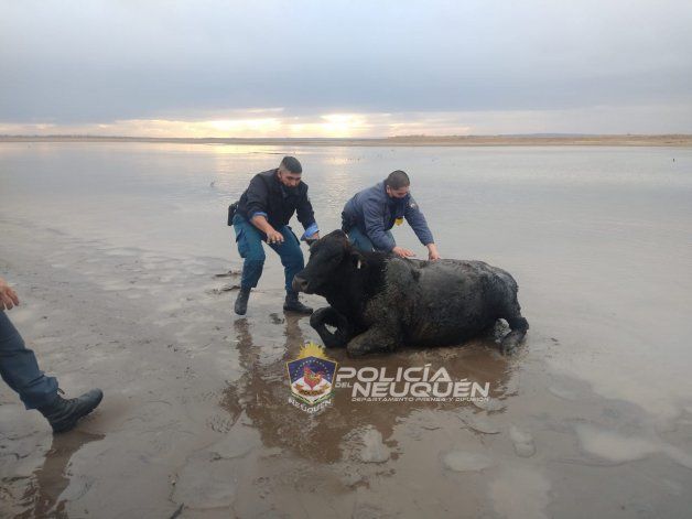 El sector donde encontraron al animal es conocido como de la virgen, en la primera bajada de acceso al lago Ramos Mexía en Picún Leufú. Cuando ya habían llevado a la vaca a tierra más segura, pudieron observar que estaba señalizada y se dieron cuenta que era de un poblador cercano. Por eso pudieron contactarse con él y el vecino se acercó con su vehículo. Entre todos pudieron subir a la vaca para que vuelva a su lugar.