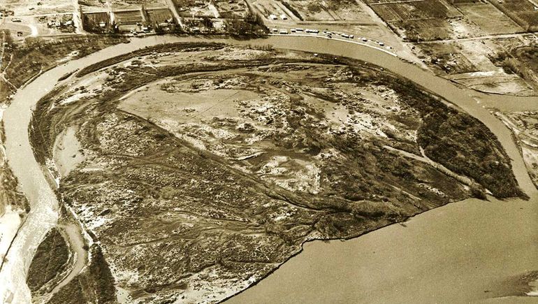 Probablemente la fotografía, que pertenece al archivo municipal y fue publicada hace poco por la revista Más Neuquén, haya sido tomada a mediados de la década del 60 para registrar una porción de tierra que por aquel entonces era prácticamente desconocida, pero con el paso del tiempo se convertiría en uno de los espacios públicos más lindos que tiene la capital neuquina: la Isla 132.