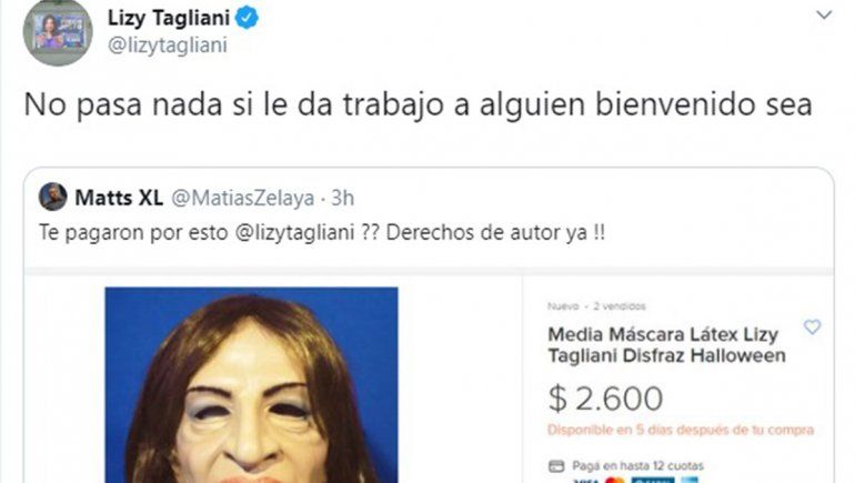 Fiel a su estilo y lejos de enojarse, Tagliani le respondió: "No pasa nada. Si le da trabajo a alguien, bienvenido sea", expresó. Como era de esperarse, el tuit generó miles de likes por parte de sus fanáticos. "En un corazón lleno de amor no hay lugar para enojos. Ojalá todos fuéramos un poquito más como vos", le escribió una usuaria de la red del pajarito. "Lizy presidenta, sos todo lo que está bien", fue otro halago que recibió.