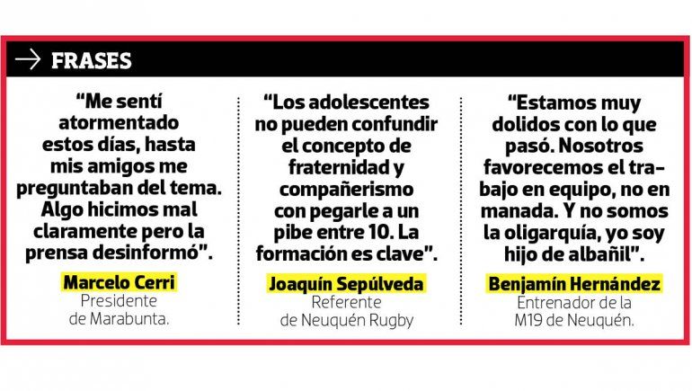 También el presidente del Neuquén Rugby avisa que el tema los inquieta. Lebermann considera que "las críticas al hecho son justas, hubo un asesinato. Nadie en ningún club baja esas conductas. Estoy convencido que hay que seguir hablando de la no violencia, si bien nuestros entrenadores lo hacen de manera cotidiana. Estamos en camino a reforzar esa temática, incluso buscando asesoramiento externo para que nos ayuden".