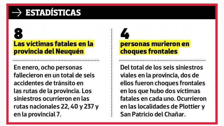 Enero suele tener un importante movimiento turístico, lo que ocasiona un tráfico vehicular desmedido en las distintas rutas. El 2020 no se diferenció de otros años, con un total de 8 víctimas fatales en varios accidentes de tránsito ocurridos en la provincia del Neuquén, la mitad en choques frontales originados por maniobras de sobrepaso.