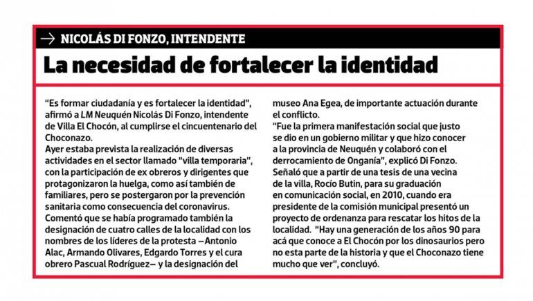 Aclara que las empresas que construían El Chocón “querían ganar dinero y no les importaba lo que les pasaba a los trabajadores; más en una Argentina donde gobernaba una dictadura militar, la de Onganía, que no iba a respetar de ninguna manera las leyes laborales, al contrario, estaban acostumbrados a no respetarlas”.