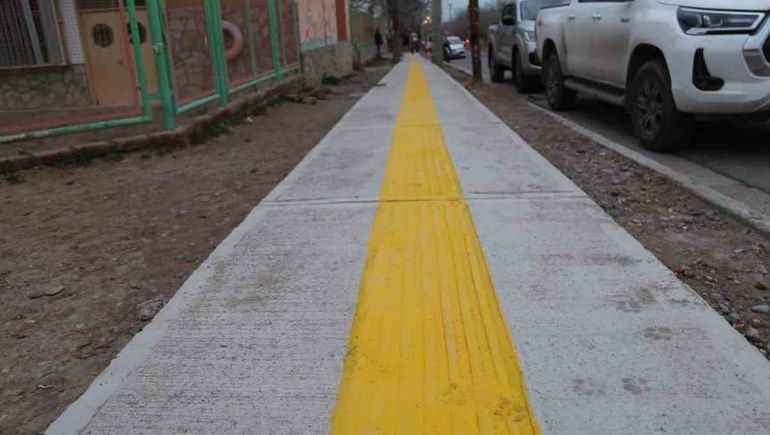La funcionaria detalló que este sistema omite el uso de baldosas amarillas “que requieren un mantenimiento en los distintos sectores. Esta vereda monolítica queda consolidada con la pintura vial, que se repone cuando se requiera por el desgaste”.
