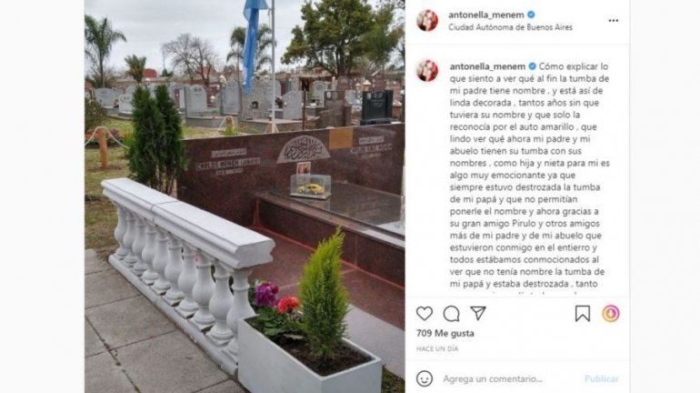 "Cómo explicar lo que siento al ver que al fin la tumba de mi padre tiene nombre y está así de linda decorada", señaló Antonella junto a la foto que muestra la tumba de Carlitos Jr. y Carlos Menem.