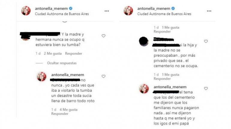 Si bien en su descargo Antonella no dirigió su denuncia a nadie en particular, una seguidora suya le preguntó. "¿Y la madre y hermana nunca se ocuparon de que estuviera bien su tumba?", haciendo clara referencia a Zulema Yoma y Zulemita Menem. "No, nunca. Yo cada vez que iba a visitarlo, la tumba era un desastre, toda sucia, llena de barro, todo roto", le contestó Antonella.