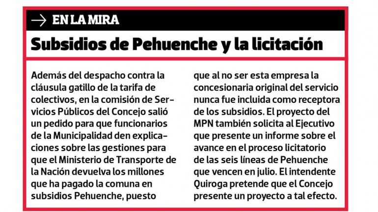 Neuquén.- La oposición a Pechi Quiroga tejió un acuerdo en el Concejo Deliberante para derogar la cláusula gatillo que determina los incrementos del precio del pasaje de colectivos en la ciudad. Los primeros puntos fueron hilvanados ayer cuando el MPN, Libres del Sur, el Frente Neuquino y el peronismo acordaron un despacho que deroga la actualización automática del precio del boleto que rige para el servicio urbano.