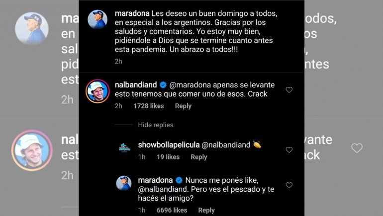 Pero el momento más picante se dio con un ex tenista. Al parecer, Diego sí presta atención a quiénes le ponen like en las fotos, y se vio sorprendido luego de recibir uno de David Nalbandian, quien según Maradona, le 'laiqueó' la foto porque estaba el famoso pescado a la pizza: "Nunca me ponés like @Nalbandiánd. pero ves el pescado y te hacés el amigo?