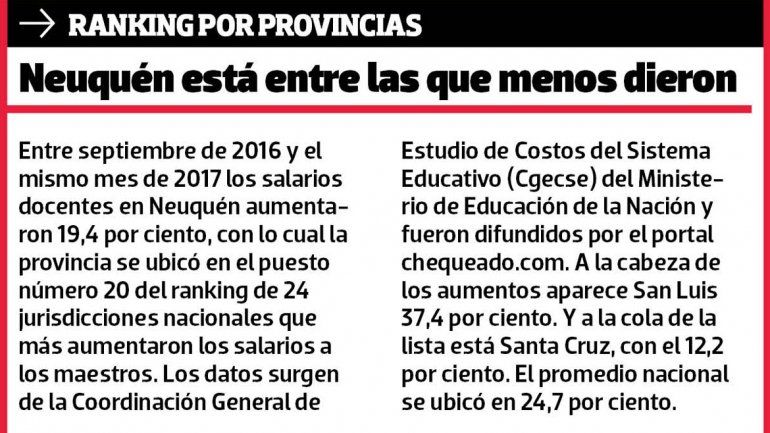 Al gobierno de Omar Gutiérrez, quien hace malabares para mantener la autonomía sin hacer enojar al poder de la Casa Rosada, esa postura le complicó la negociación con los gremios. En Neuquén, los docentes, como el resto del personal del Estado, tienen un acuerdo salarial vigente hasta marzo. El mismo implica la adecuación de los salarios cada tres meses en función del promedio de los índices de inflación de Neuquén, Córdoba y el Indec.