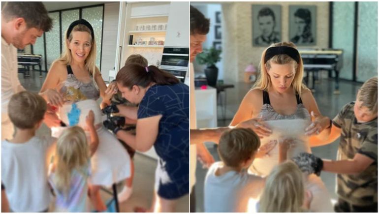 En las imágenes se la puede ver a la argentina rodeada de toda su familia mientras le colocan una especie de molde alrededor de la pancita de embarazada.