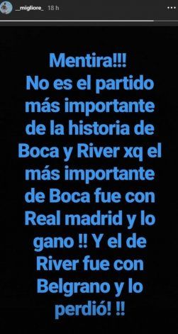 "¡¡¡Mentira!!! ¡¡No es el partido más importante de Boca y River porque el más importante de Boca fue con Real Madrid y lo ganó!! ¡¡Y el de River fue con Belgrano y lo perdió!!", escribió en una historia.