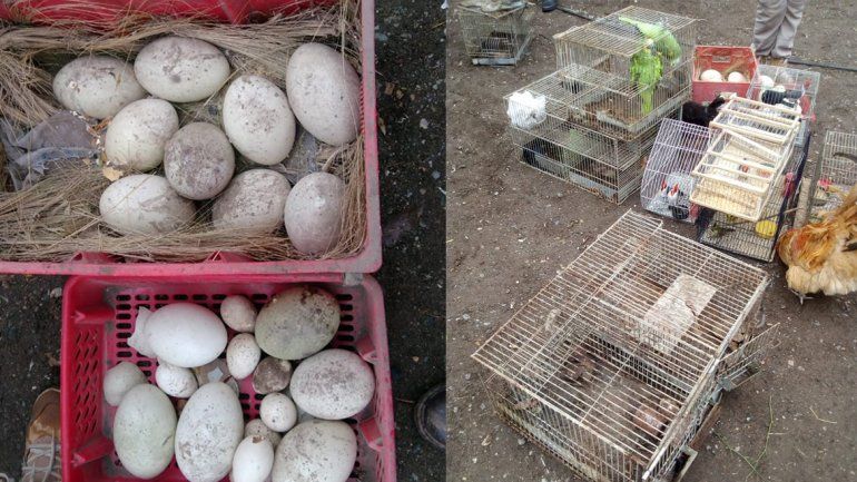 En el lugar se encontraron dos choiques, siete charitos, tres martinetas, ocho cardenales, ocho tordos, dos cardenales amarillos, dos tortugas, dos loros, dos cotorras y 22 huevos. Además, se secuestraron jaulas, un trofeo de ciervo sin autorización y una incubadora.