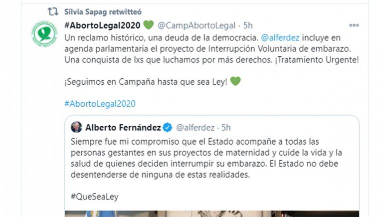 En este sentido, Sapag retuiteó un posteó de la cuenta #AbortoLegal2020, el cual detallaba: “Un reclamo histórico, una deuda de la democracia. @alferdez incluye en agenda parlamentaria el proyecto de Interrupción Voluntaria de embarazo. Una conquista de lxs que luchamos por más derechos. ¡Tratamiento Urgente! ¡Seguimos en Campaña hasta que sea Ley! #AbortoLegal2020”.