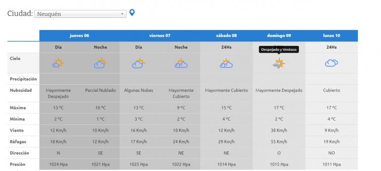 Para este miércoles desde el servicios de meteorología local anunciaron que se espera una mínima de 0 grados para la noche pero durante el mediodía y la tarde la máxima podría alcanzar los 16°C con cielo despejados pero con algunas ráfagas que podría superar los 60 kilómetros por hora.