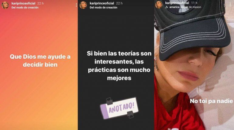 “Que Dios me ayude a decidir bien. Si bien las teorías son interesantes, las prácticas son mucho mejores”, expresó la cantante seguido de una selfie donde se deja ver cansada y desilusionada. “No estoy para nadie”, explicó Karina.