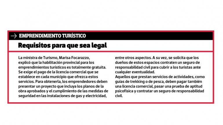La ministra de Turismo, Marisa Focarazzo, explicó que es necesario que todos los emprendimientos ligados a turismo cumplan con las exigencias establecidas en la Ley 2414, sancionada en el 2000, que establece la obligatoriedad de contar con una habilitación provincial para ofrecer alojamiento a los viajeros.