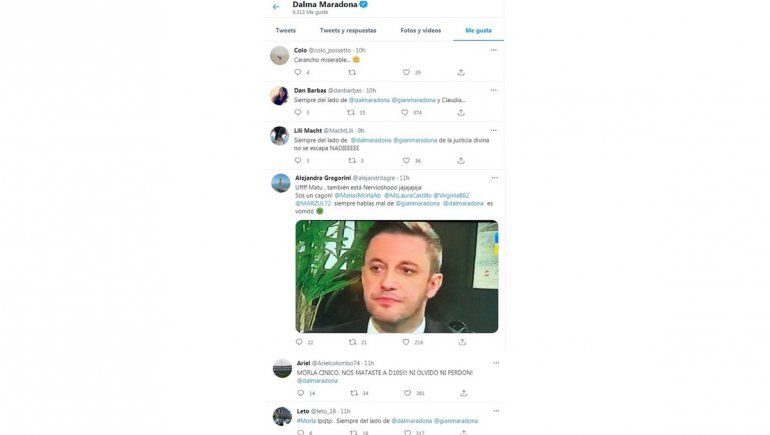 En tanto, Dalma apoyó mensajes de algunos internautas que se despacharon feo contra Morla. “Uffff Matu, también está nerviosho. Sos un cagón. Siempre hablás mal de Gianinna Maradona y Dalma Maradona, vómito”; “Siempre del lado Dalma Maradona y Gianinna Maradona, de la justicia divina no se escapa nadie”, “Siempre del lado de Dalma, Gianinna y Claudia” y “Carancho miserable”, fueron otros de los mensajes que la actriz celebró.